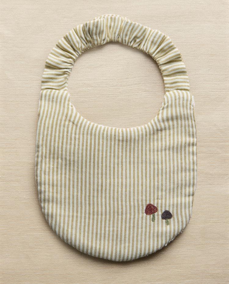 Детский нагрудник из тонкой хлопчатобумажной махровой ткани и муслина с полосатым узором из окрашенных нитей и вышивкой в виде грибов по бокам.