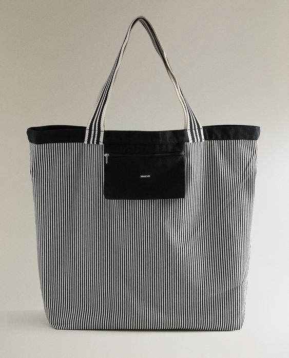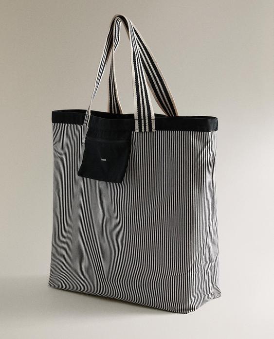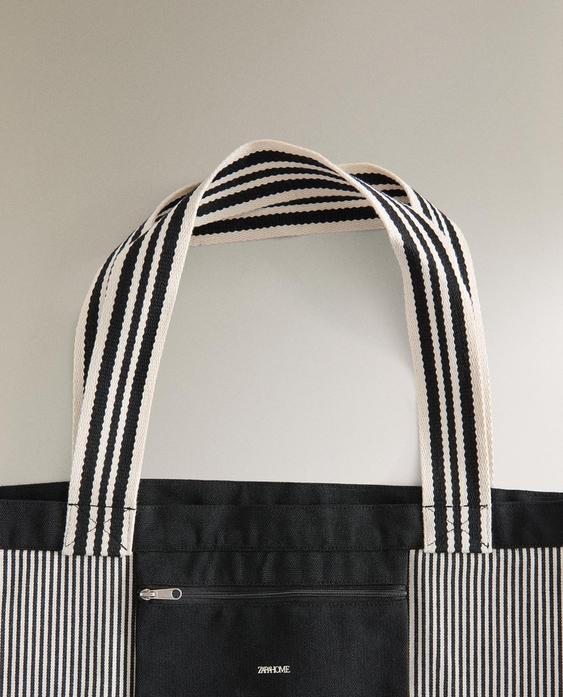 ZARA HOME ДВУСТОРОННЯЯ ПОЛОСАТАЯ ТКАНЕВАЯ СУМКА-ШОППЕР, ЧЕРНЫЙ
