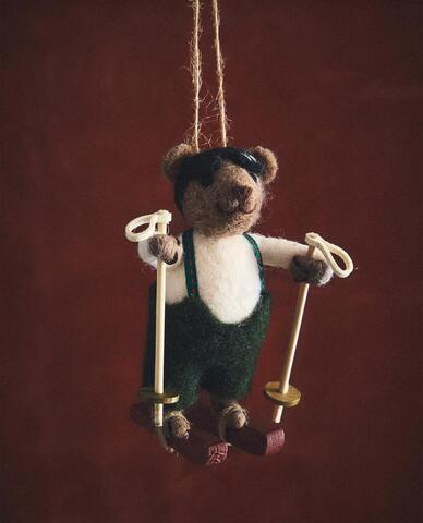 Шерстяное украшение на елку с изображением медведя-лыжника в зеленом комбинезоне.