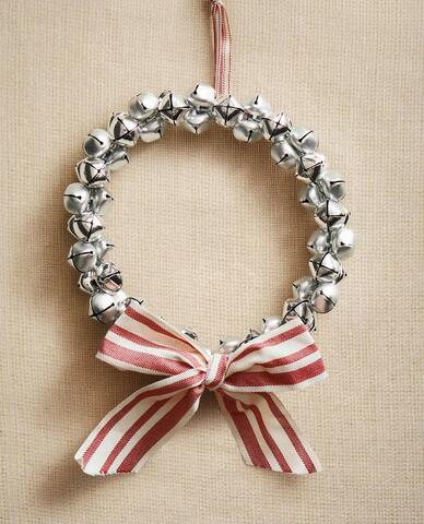 Декоративный венок на дверь, состоящий из колокольчиков и центрального полосатого банта, на Рождество.