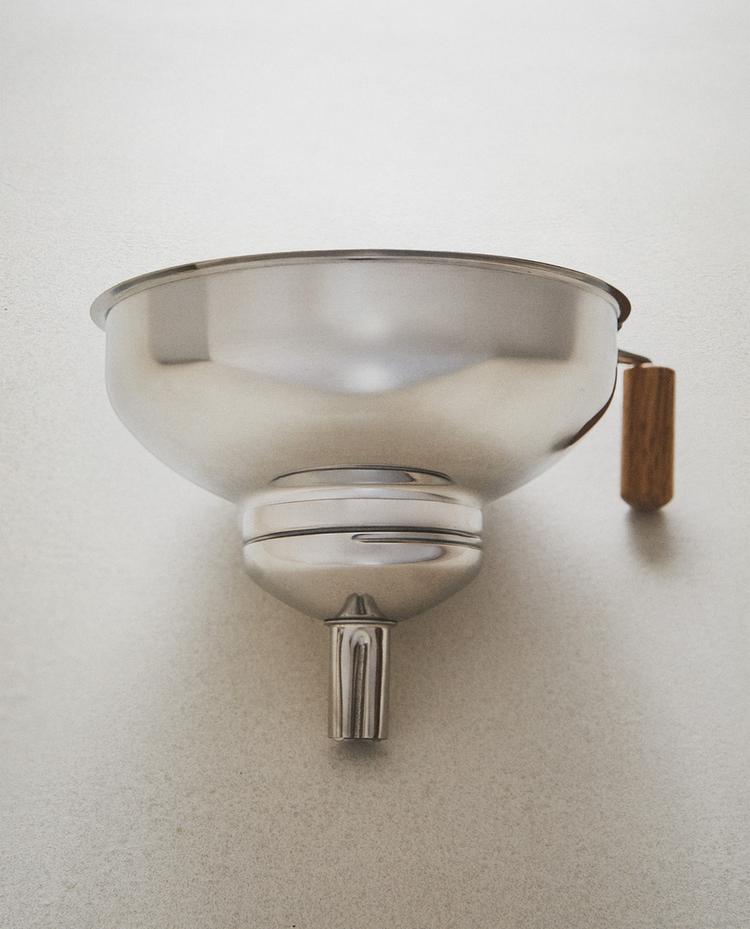 Воронка из нержавеющей стали с носиком для точного наливания. Съемный дуршлаг и ручка из дубового дерева для надежного захвата, обеспечивающие легкое и контролируемое наливание.