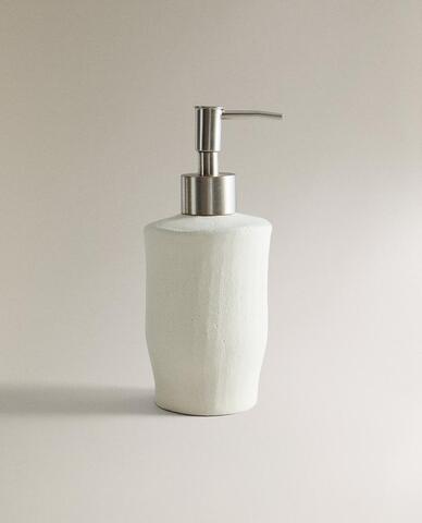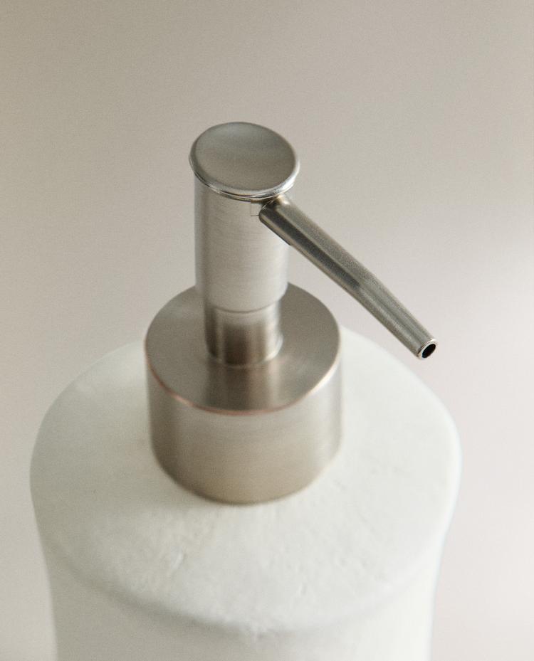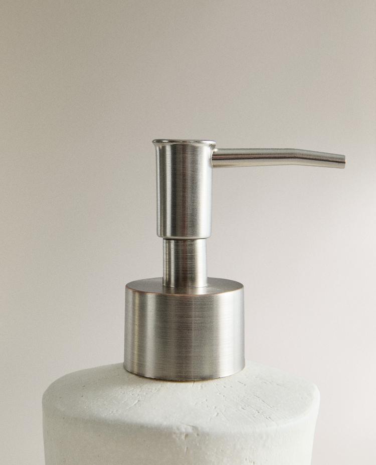 Керамический дозатор для мыла с матово-белой поверхностью и шероховатой текстурой. Дозатор выполнен из металла цвета матовой стали.