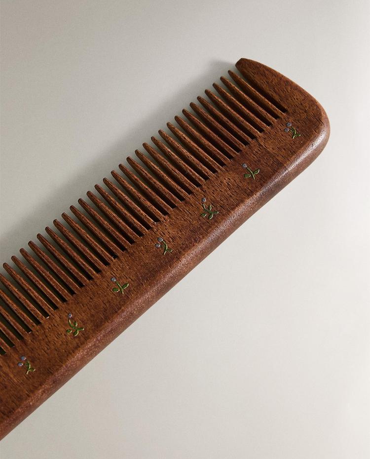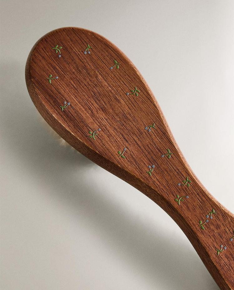 Деревянный набор из расчески и щетки с небольшим цветочным рисунком, в коробке.