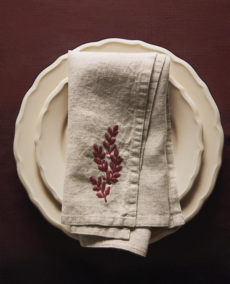 Льняные рождественские салфетки с вышитыми красными листьями.