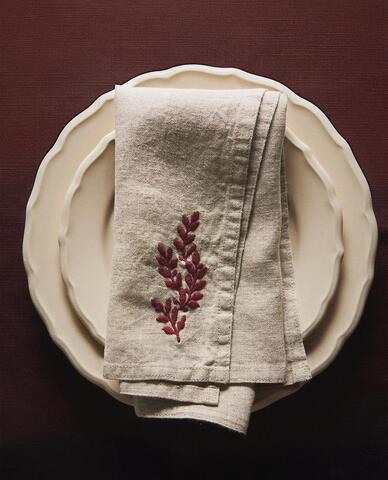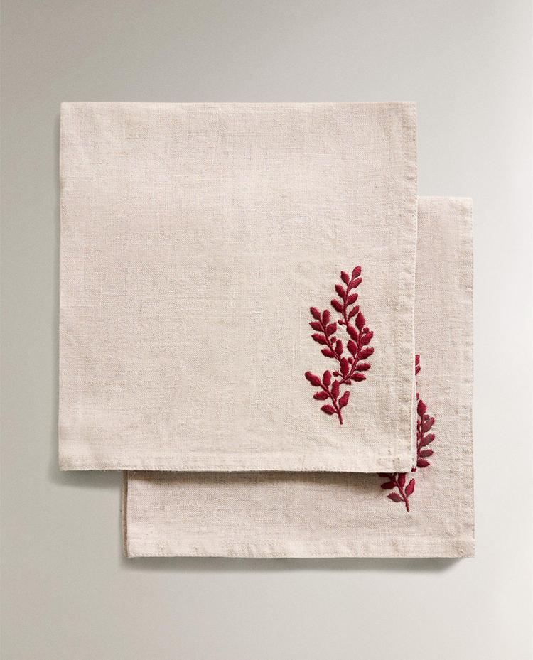 ZARA HOME НАБОР ЛЬНЯНЫХ РОЖДЕСТВЕНСКИХ САЛФЕТОК С КРАСНЫМИ ЛИСТЬЯМИ (УПАКОВКА ИЗ 2 ШТУК), КРАСНЫЙ