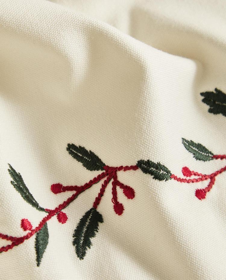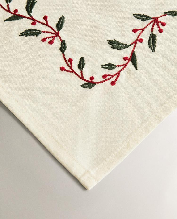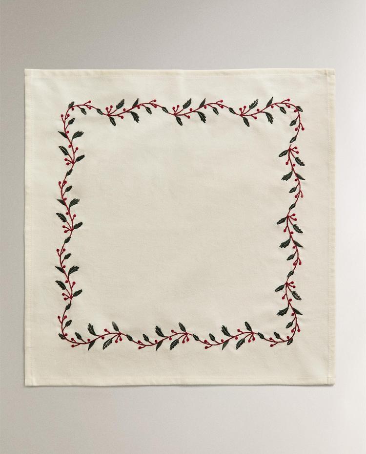 Хлопковая новогодняя салфетка с вышитыми листьями и ягодами по краю, образующими центральный декоративный прямоугольник.