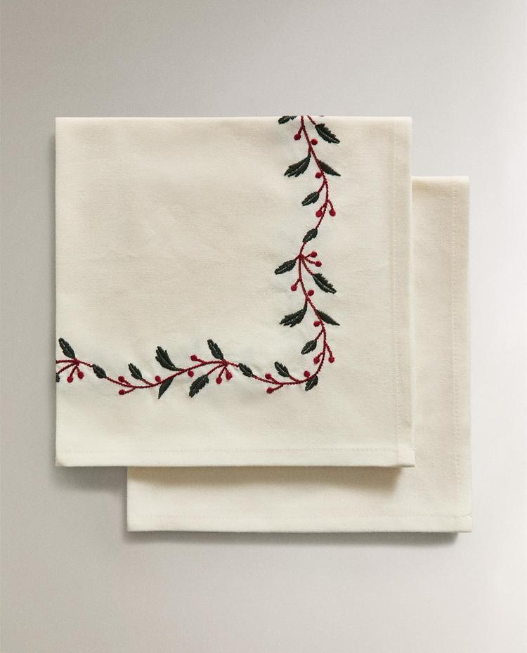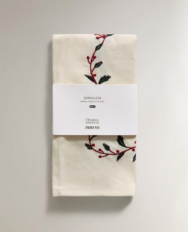 ZARA HOME НАБОР ЛЬНЯНЫХ РОЖДЕСТВЕНСКИХ САЛФЕТОК С ВЫШИВКОЙ, ЗЕЛЕНЫЙ