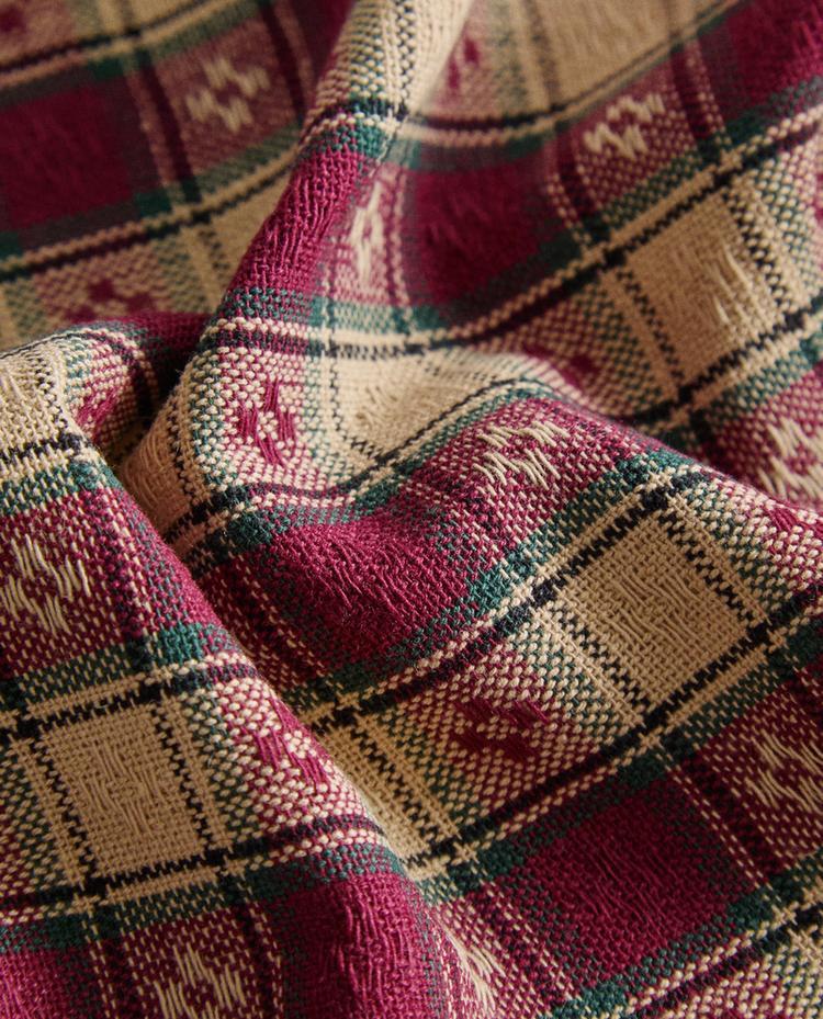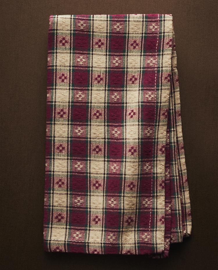 Хлопковая новогодняя салфетка с узором в клетку, выполненным крашеными нитками, и декоративными деталями.
