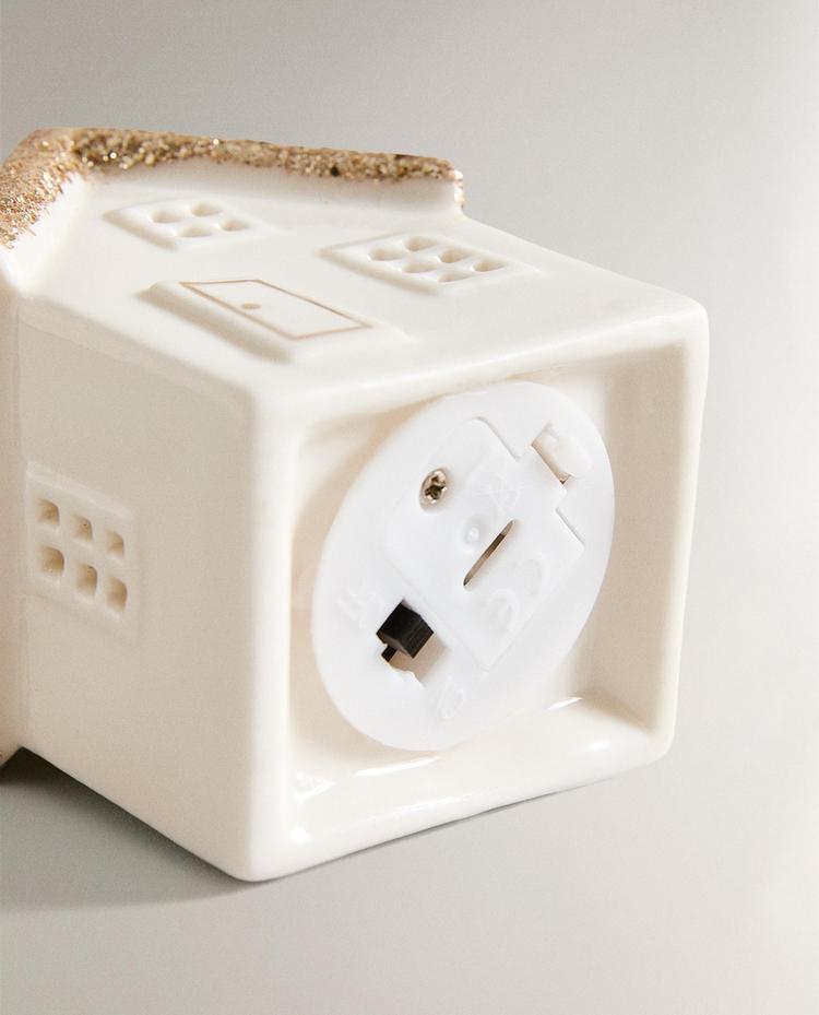 Фарфоровое ёлочное украшение в форме домика с блестящей крышей и лампочкой внутри.