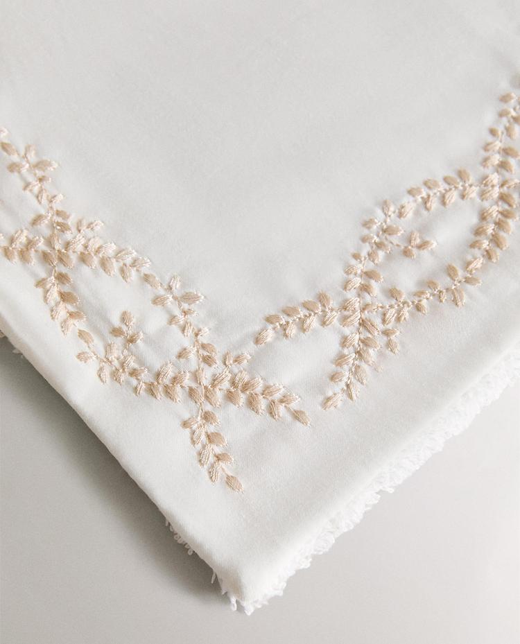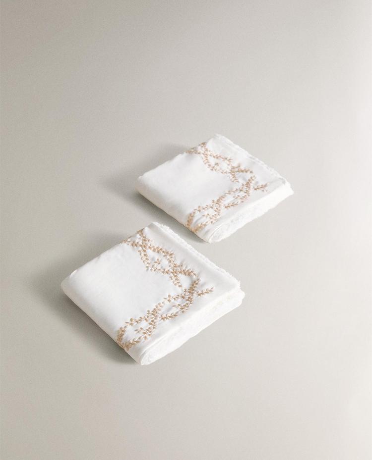 Гостевое полотенце из хлопковой махровой ткани с каймой, украшенной вышивкой в виде растений. Продается в упаковках по 2 штуки.