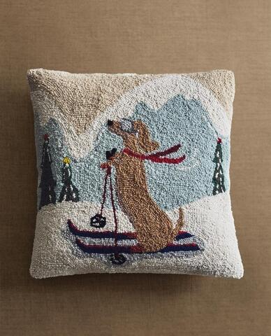 Рождественская наволочка из хлопка и шерсти с рельефной вышивкой в виде таксы на лыжах.