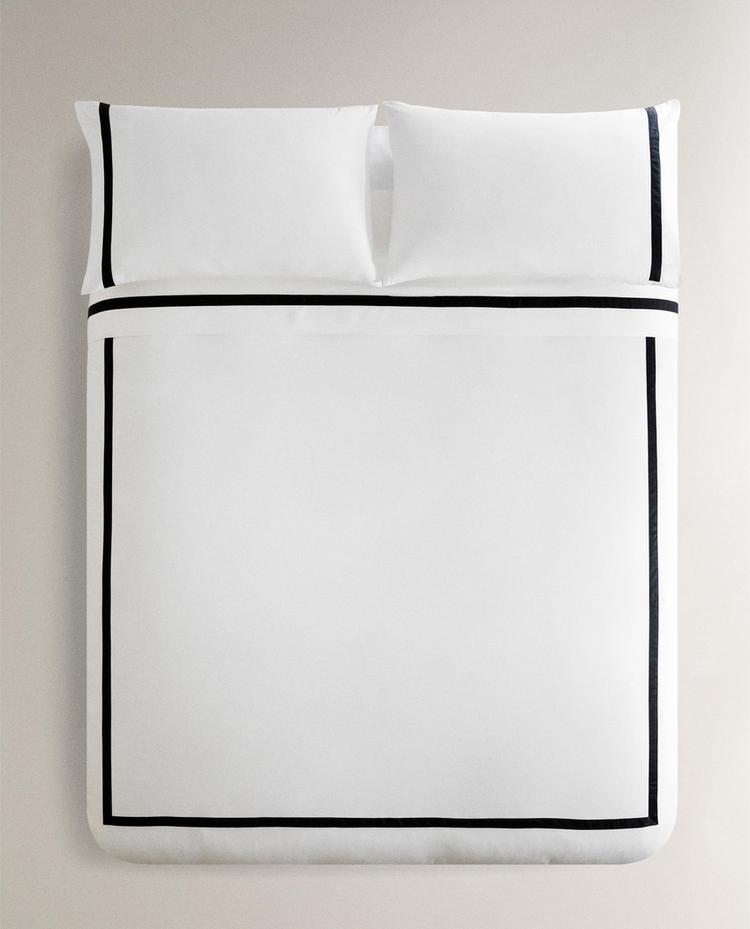 Пододеяльник из хлопкового сатина плотностью 300 нитей на дюйм с контрастной каймой по краю.