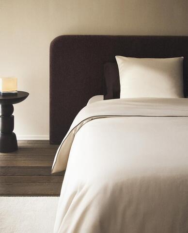 Пододеяльник из хлопкового сатина плотностью 300 нитей на дюйм, с однотонным рисунком и контрастной окантовкой.