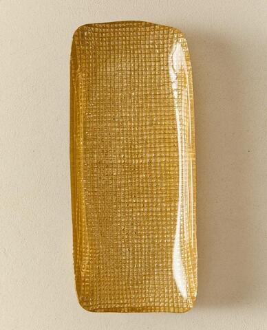 Прямоугольное стеклянное сервировочное блюдо с неровной текстурой и блестящим золотистым покрытием.