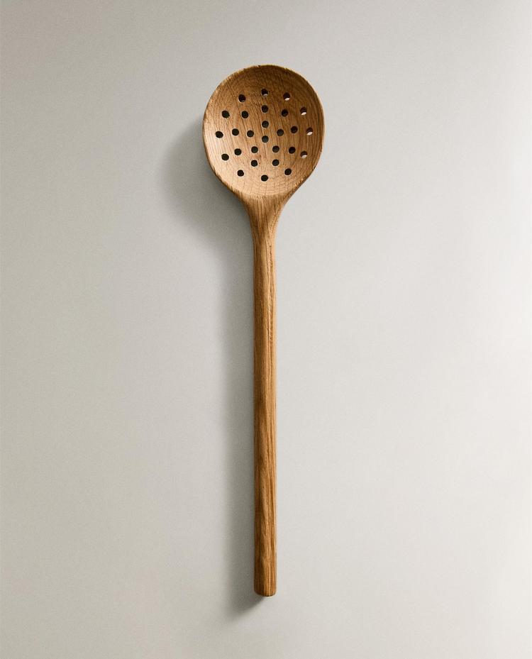 Кухонная шумовка из дуба с перфорированной головкой и длинной ручкой, предназначенная для легкого зачерпывания и слива, сохраняя комфортное расстояние от жара.