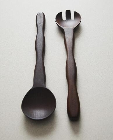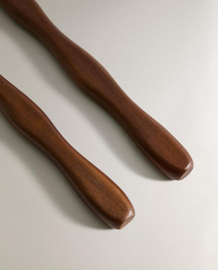 Сервировочные приборы из древесины акации. Ручка имеет рельефный волнообразный узор.