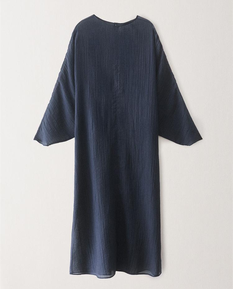 Длинное, полупрозрачное платье из легкой и струящейся ткани с круглым вырезом, широким и воздушным кроем и свободными рукавами, обеспечивающими свободу движений.