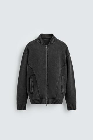 Куртка свободного кроя из компактного трикотажа, связанного из хлопковой пряжи. Воротник-стойка и длинные рукава. Прорезные карманы на бедрах. Отделка в рубчик. Эффект потертости. Застежка-молния.