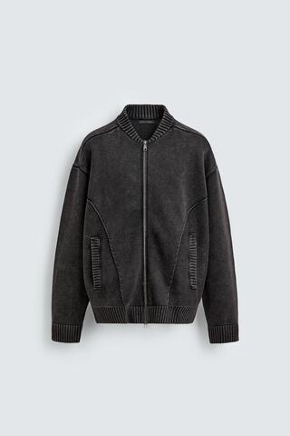 Куртка свободного кроя из компактного трикотажа, связанного из хлопковой пряжи. Воротник-стойка и длинные рукава. Прорезные карманы на бедрах. Отделка в рубчик. Эффект потертости. Застежка-молния.