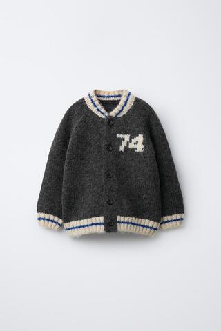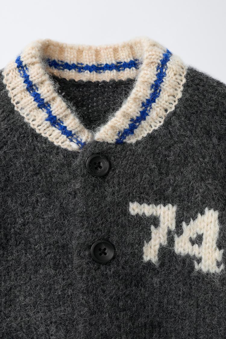 Вязаный кардиган с V-образным вырезом и длинными рукавами. Застегивается на пуговицы спереди. Принт с цифрами на груди. Изделие содержит 21% шерсти.