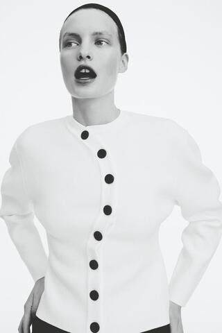 Куртка с круглым вырезом и длинными рукавами, широкая пройма сужается к запястью. Приталенная талия. Двубортная застежка на пуговицы спереди.