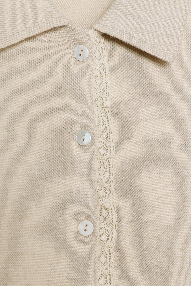 Кардиган с отложным воротником и короткими рукавами. Контрастная кружевная отделка. Застежка на пуговицы.