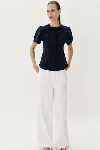 Приталенный кардиган с круглым вырезом и короткими объемными рукавами с разрезами. Застегивается на обтянутые пуговицы в тон.