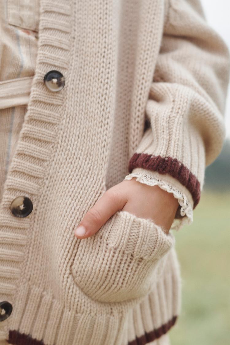 Кардиган с V-образным вырезом, длинными рукавами и пуговицами спереди. Передний карман с накладкой. Яркая отделка контрастного цвета. 100% шерсть.