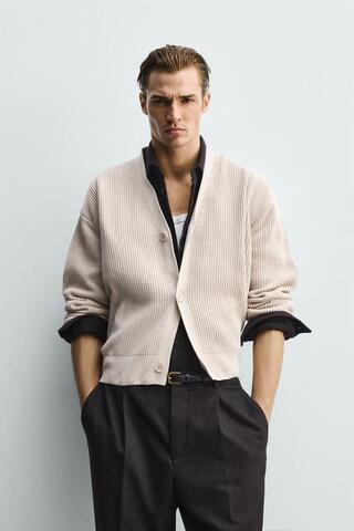 Кардиган свободного кроя. V-образный вырез и длинные рукава. Отделка в рубчик. Застежка на пуговицы спереди.