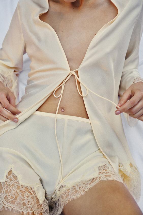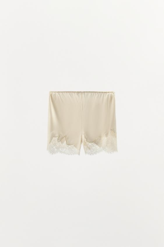 ZARA КАТЛАСНЫЕ ШОРТЫ С КРУЖЕВОМ, ЭКРЮ