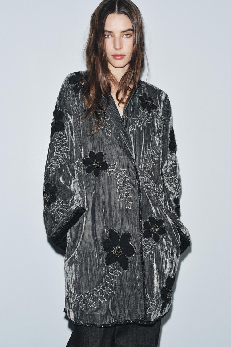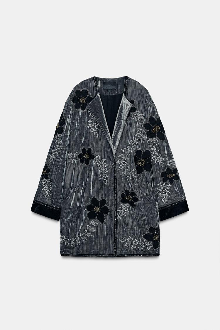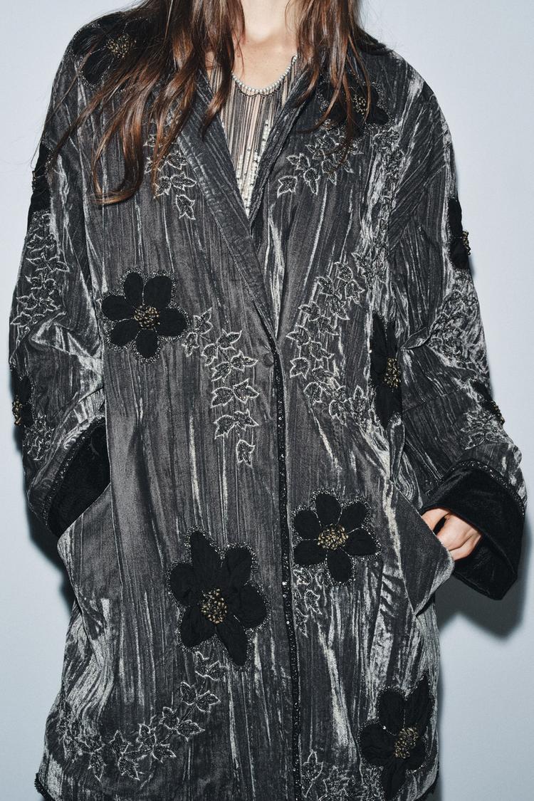 ZARA КИМОНО ИЗ ВЫШИТОГО БАРХАТА — ZW COLLECTION LIMITED EDITION, СЕРЫЙ