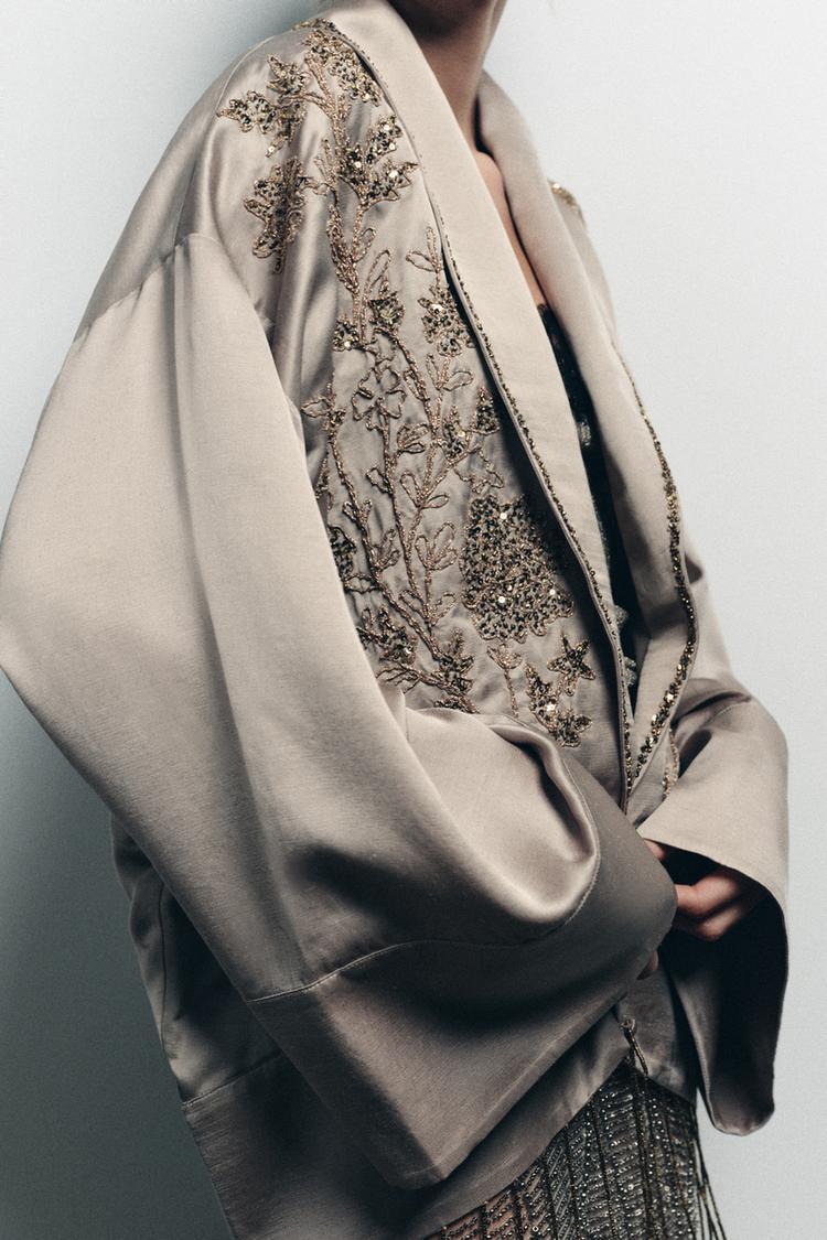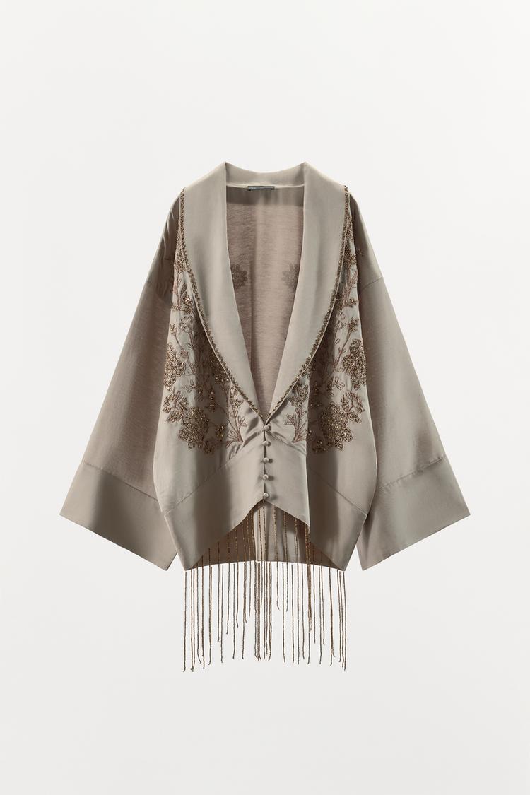 ZARA КИМОНО С ВЫШИВКОЙ И БУСИНАМИ, СЕРЫЙ