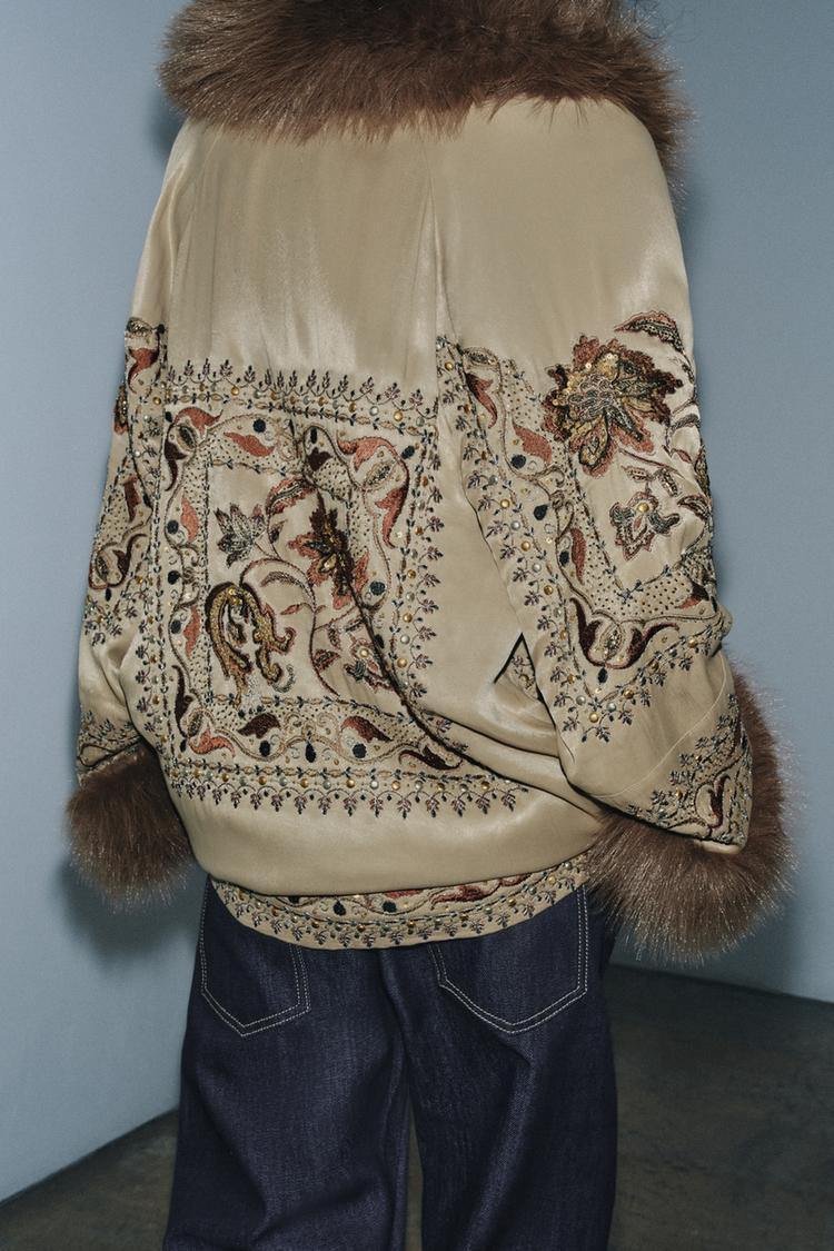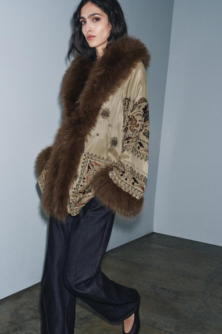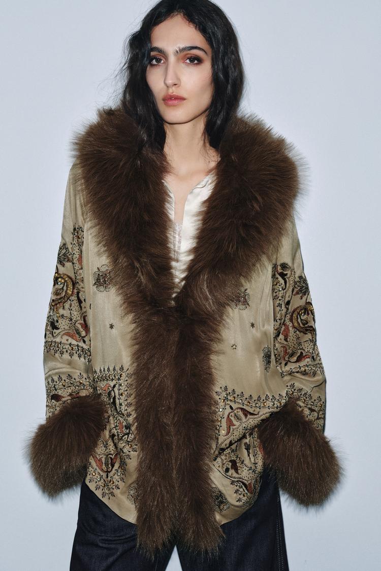 Кимано с V-образным вырезом и длинными рукавами. Вышивка с бусинами. Контрастные вставки с эффектом меха. Прямой низ, застежка спереди.