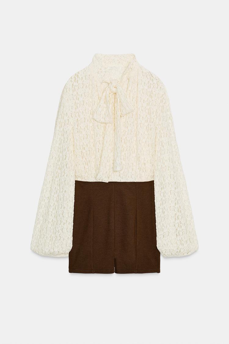 ZARA ККОМБИНИРОВАННЫЙ КОРОТКИЙ КОМБИНЕЗОН С ЗАВЯЗКОЙ, ЭКРЮ/КОРИЧНЕВЫЙ