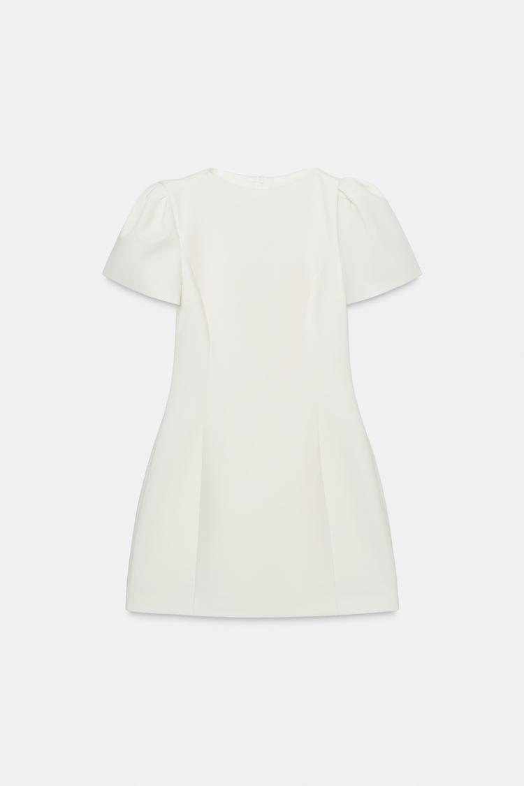 Короткое платье с вырезом «лодочка» и короткими рукавами со складками. Отстроченные швы. Потайная застежка-молния сзади.