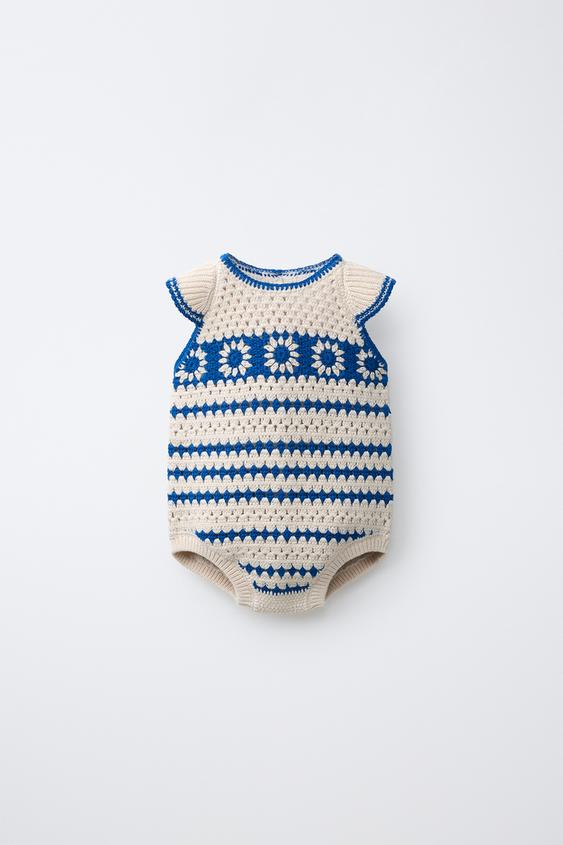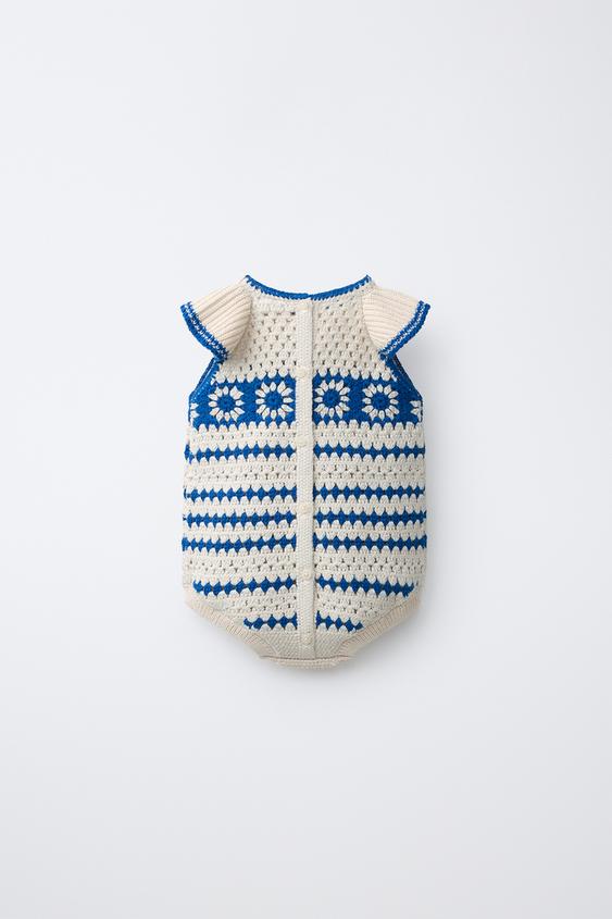 ZARA КОМБИНЕЗОН ИЗ КРУЖЕВА КРОШЕ, ЭКРЮ/СИНИЙ