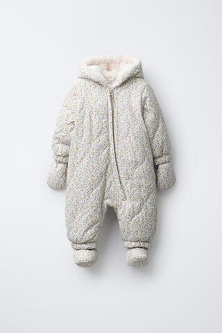 Цельнокроеный костюм с капюшоном и длинными рукавами с эластичными манжетами. Застежка спереди на молнию. Съемные варежки и пинетки застегиваются на кнопки. Подкладка из искусственной овечьей шерсти. Цветочный принт.