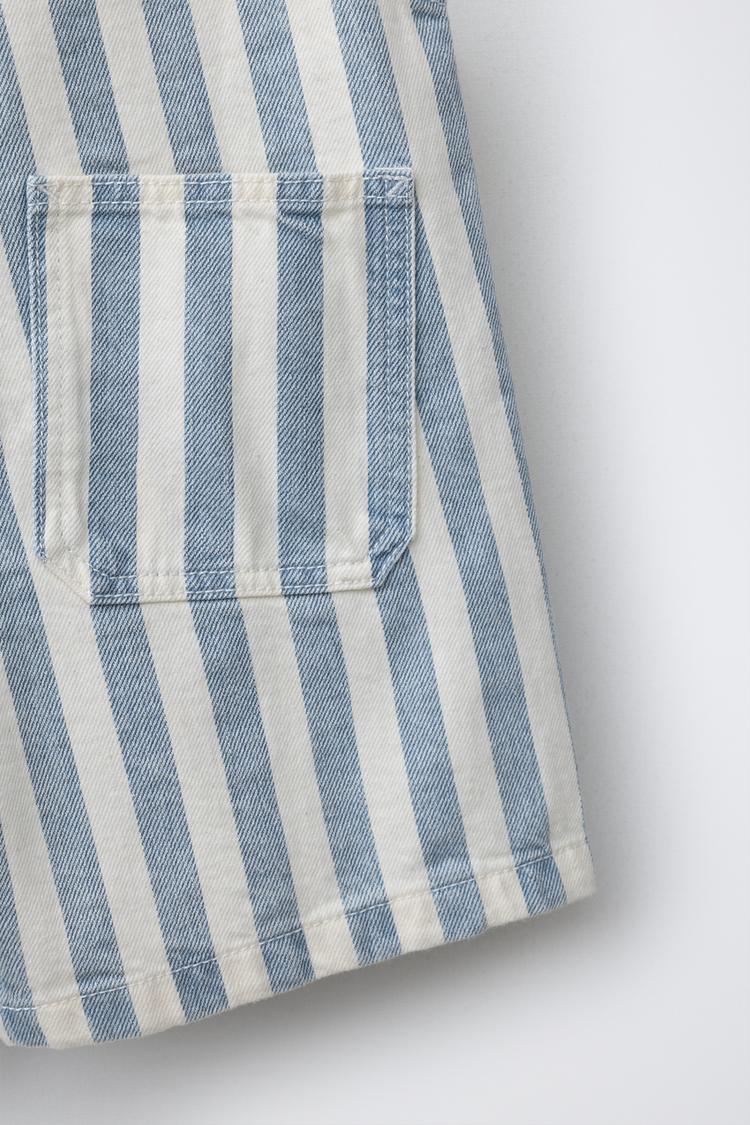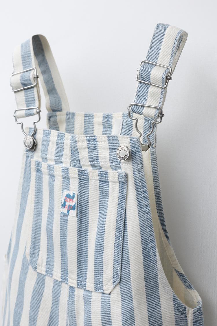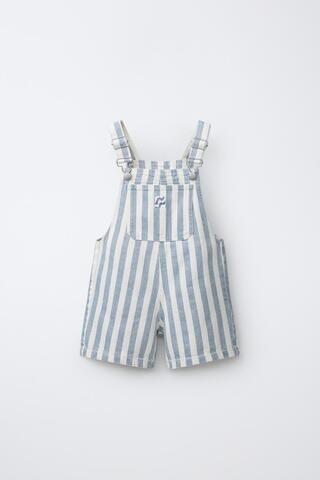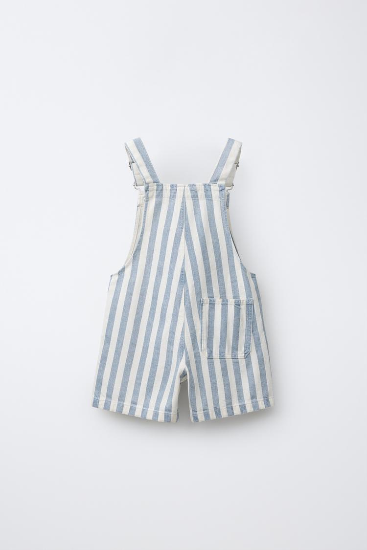 Короткий комбинезон с квадратным вырезом и регулируемыми бретелями на пряжках. Нагрудный накладной карман с нашивкой. Ткань в полоску.