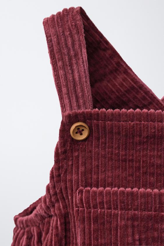 Вельветовый комбинезон с квадратным вырезом и бретелями, застегивающимися на пуговицы спереди. Застегивается на кнопки внизу. Нагрудный накладной карман. Внутренняя подкладка.
