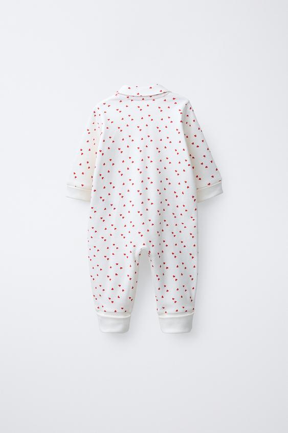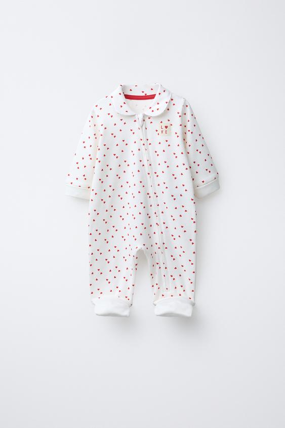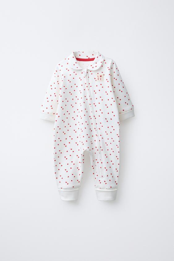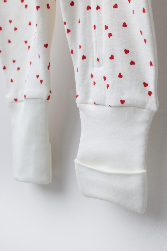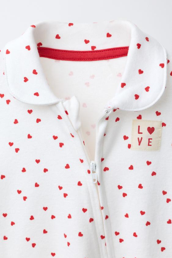 Пижама с отложным воротником и регулируемыми длинными рукавами. Регулируемый низ с возможностью превращения в носки, закрытая пижама. Застежка-молния. Принт в виде сердечек и этикетка на груди.