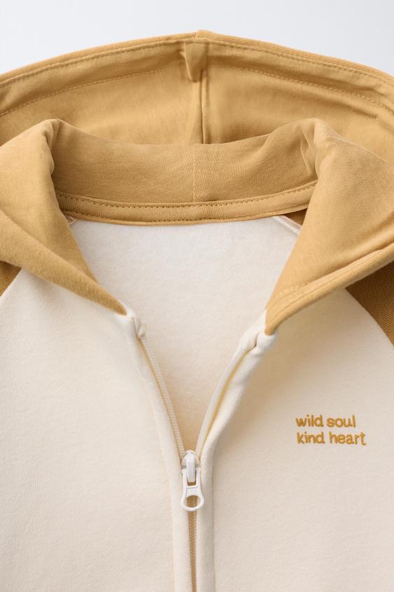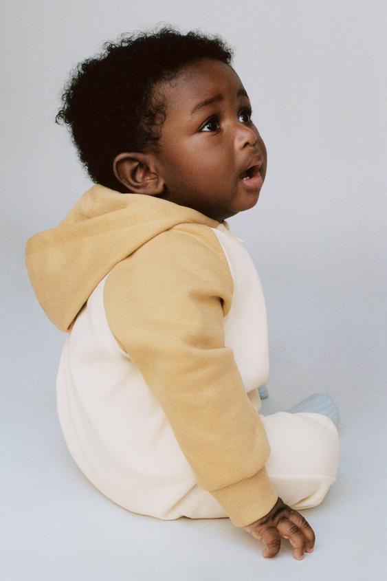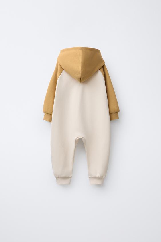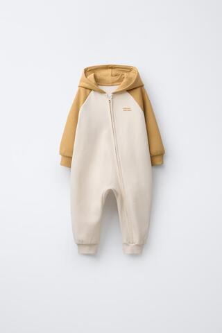Длинный комбинезон с капюшоном и длинными рукавами. Отделка в рубчик. Застежка-молния спереди. Текстовый рельефный принт на груди. Внутренняя сторона с начесом, теплая и мягкая.