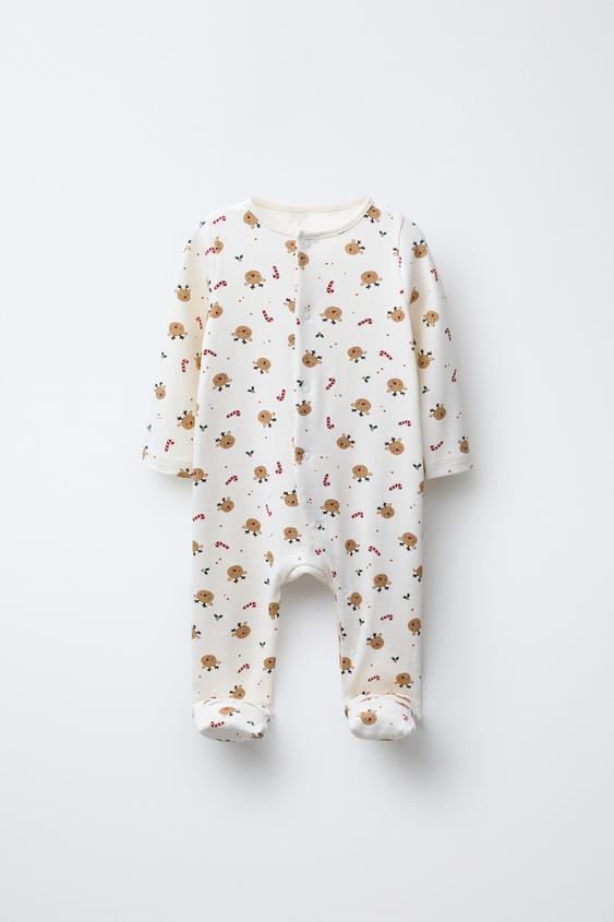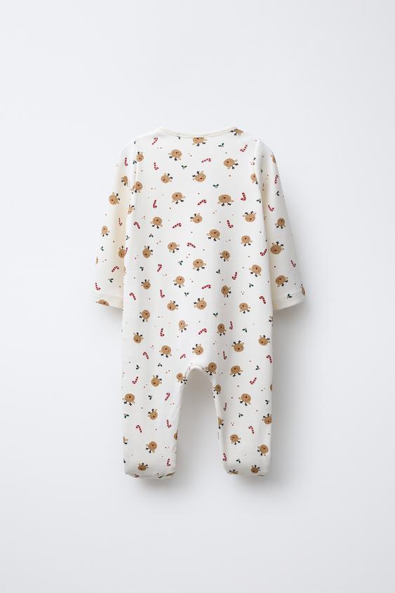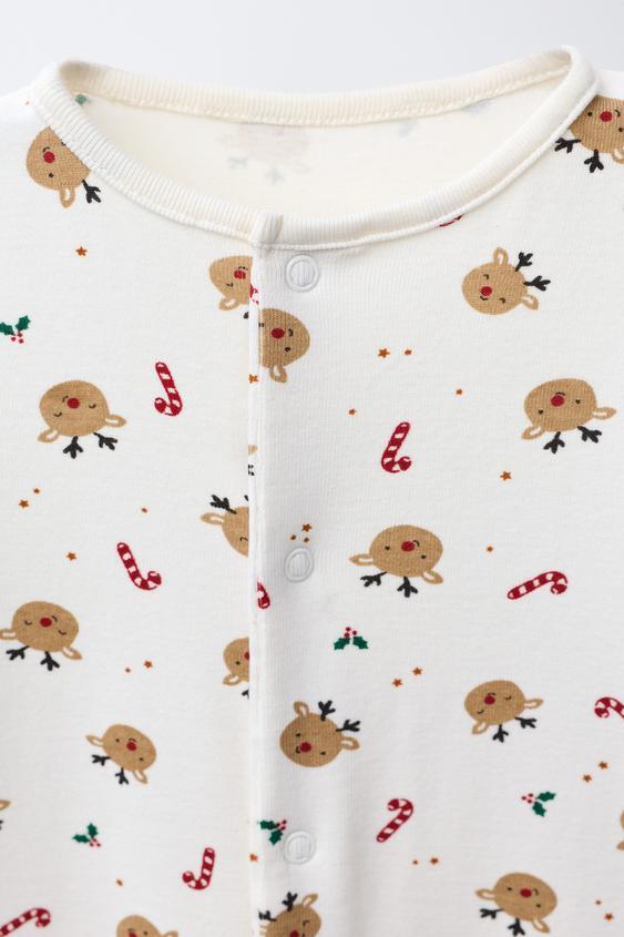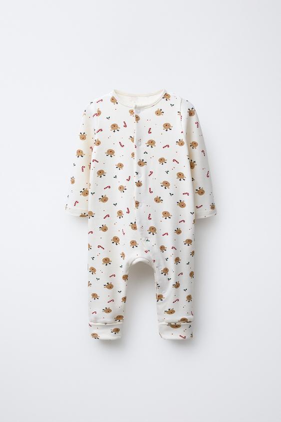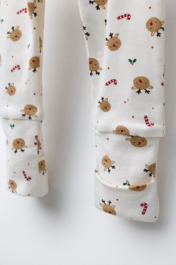 Комбинезон с круглым вырезом и длинными рукавами. Регулируемый низ, который можно трансформировать в пинетки. Застегивается на кнопки спереди. Принт с оленями.