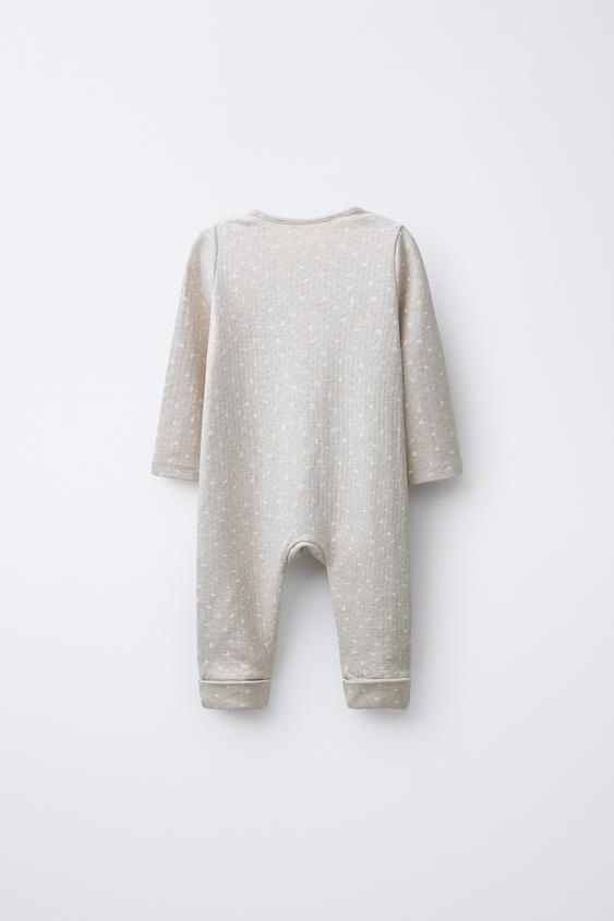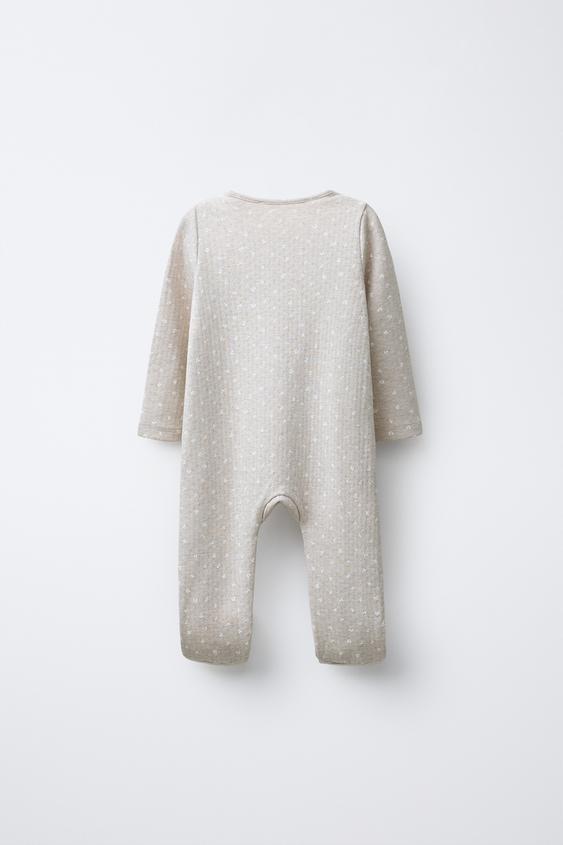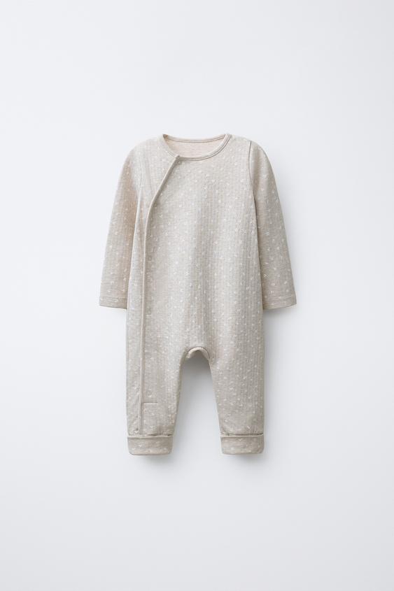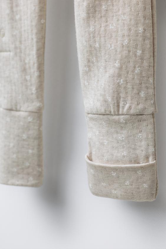 Пижама с V-образным вырезом и длинными рукавами. Регулируемый низ, который можно трансформировать в пинетки. Перекрестная застежка спереди на кнопки.