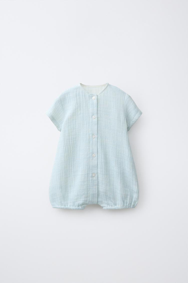 Комбинезон с круглым вырезом и короткими рукавами. Застегивается на пуговицы спереди. Эластичные нижние кромки. В полоску.