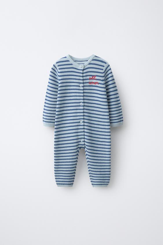 ZARA КОМБИНЕЗОН В ПОЛОСКУ С ВЫШИТОЙ НАДПИСЬЮ, ГОЛУБОЙ