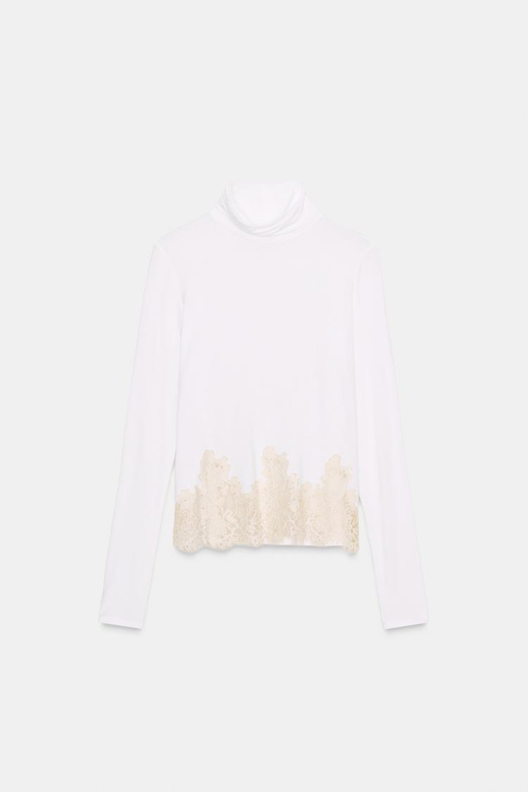 ZARA КОМБИНИРОВАННАЯ ФУТБОЛКА С КРУЖЕВОМ, ЖЕЛТОВАТО-БЕЛЫЙ