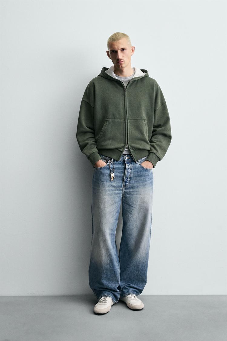 Худи свободного кроя из хлопка с внутренней вафельной структурой. Капюшон и длинные рукава. Передние карманы. Эффект потертости. Отделка в рубчик. Застежка-молния спереди.
