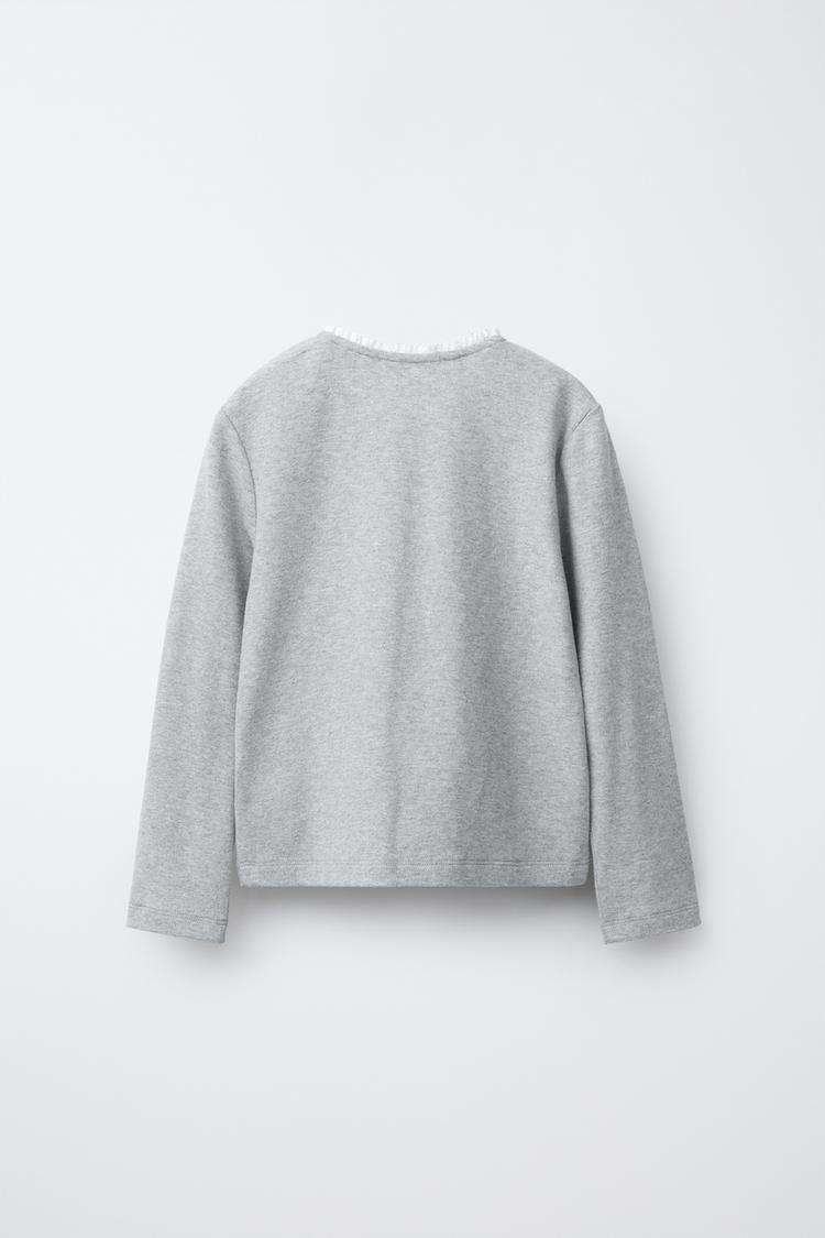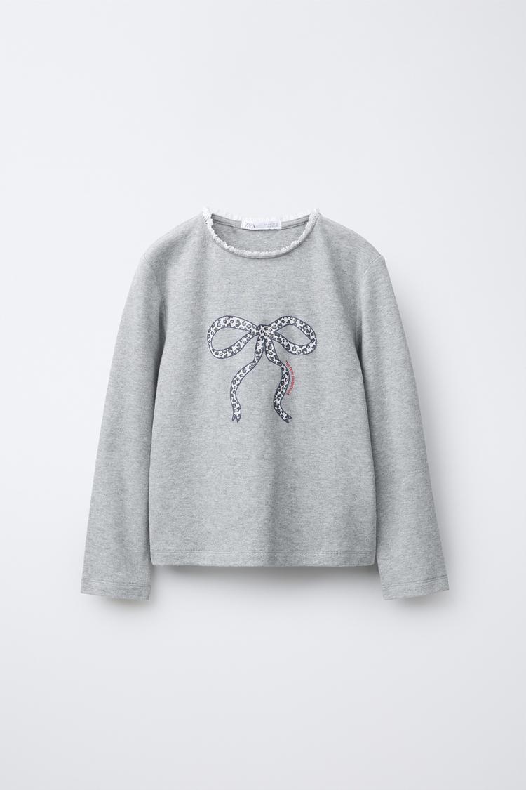 Пижама из двух предметов. Футболка с круглым вырезом, кружевной отделкой и длинными рукавами. Бант с анималистичным принтом спереди. Брюки с эластичным поясом и декоративными пуговицами спереди. Принт в полоску.