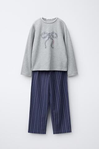 ZARA КОМБИНИРОВАННАЯ ПИЖАМА В ПОЛОСКУ С БАНТОМ, СИНИЙ
