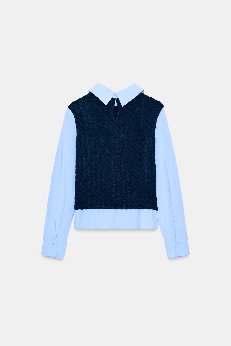 ZARA КОМБИНИРОВАННАЯ РУБАШКА ИЗ ПОПЛИНА, МОРСКОЙ СИНИЙ